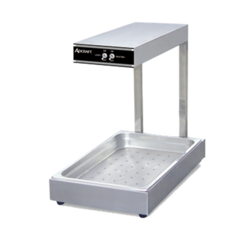 Keep your french fries, onion rings, and other fried foods hot, crisp, and ready to serve with the Adcraft IDW-940W Infrared Display Warmer. This countertop unit is designed for durability and efficiency in any busy commercial kitchen or concession stand. The heavy-duty stainless steel construction ensures long-lasting performance, while the polished reflectors above the heating elements effectively radiate heat downwards, maintaining optimal food temperature. The uniform heat distribution guarantees that every serving is as warm as the first. Its raised base design allows for easy three-sided access and keeps the food pan elevated from the work surface for better hygiene and convenience. This warmer comes complete with a full-size food pan and a perforated liner, making it ready to use right out of the box.