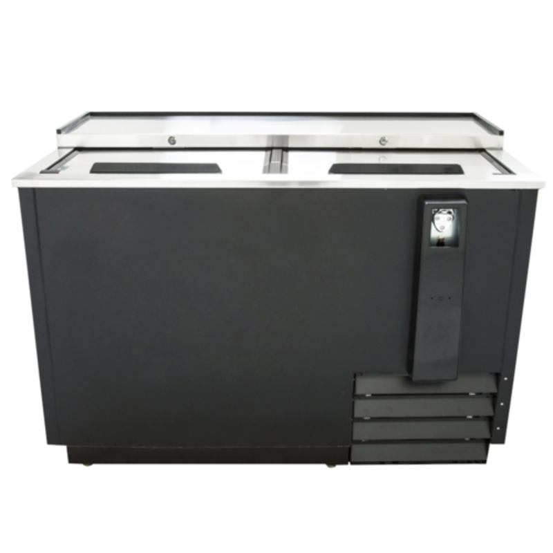 Engineered for convenience, the USBC-50 features smooth-gliding, lockable stainless steel lids that provide easy access and secure your inventory after hours. A built-in bottle opener and cap catcher streamlines your workflow, keeping your service area tidy. The reliable refrigeration system uses environmentally friendly R134A refrigerant and maintains a consistent temperature range of 32°F to 41°F. Foamed-in-place polyurethane insulation and automatic defrosting further enhance efficiency and ensure worry-free operation. This ETL Listed and ETL Sanitation certified cooler is a dependable addition to any commercial beverage service.
